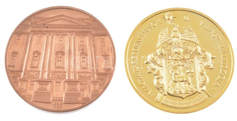 Györfi Sándor (1951-) 1988. Debreceni Református Kollégium ‘1538 – 1988 / CDL ANNI COLLEGII REFORMATORUM DEBRECENENSIS – ORANDO ET LABORANDO’ kétoldalas bronz emlékérem (42mm) + Lebó Ferenc (1960-) 1991. ‘Magyar Reformátusok II. Világtalálkozója’ aranyozo
