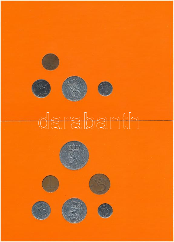 Hollandia 1968-1970. 1c-2 1/2G négy különböző, nem hivatalos forgalmi összeállítás három különböző évből, narancssárga kartonlapon, összesen 23xklf érmével T:1–2- Netherlands 1968-1970. 1 Cent – 2 1/2 Gulden four unofficial