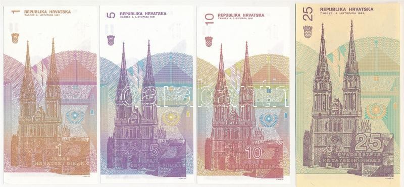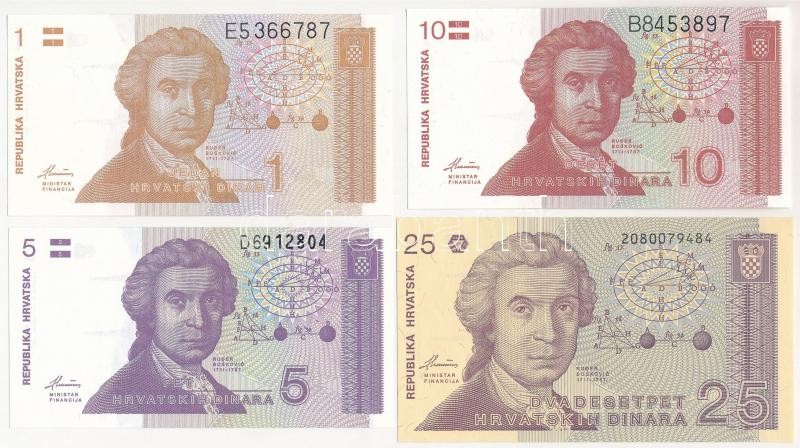 Horvátország 1991. 1D + 5D + 10D + 25D T:I,I- Croatia 1991. 1 Dinar + 5 Dinara + 10 Dinara + 25 Dinara C:UNC,AU<a href="https://www.darabanth.com/hu/gyorsarveres/409/kategoriak~Numizmatika/Kulfoldi-bankjegyek~2500013/Horvatorszag-1991-1D-plus-5D-plu