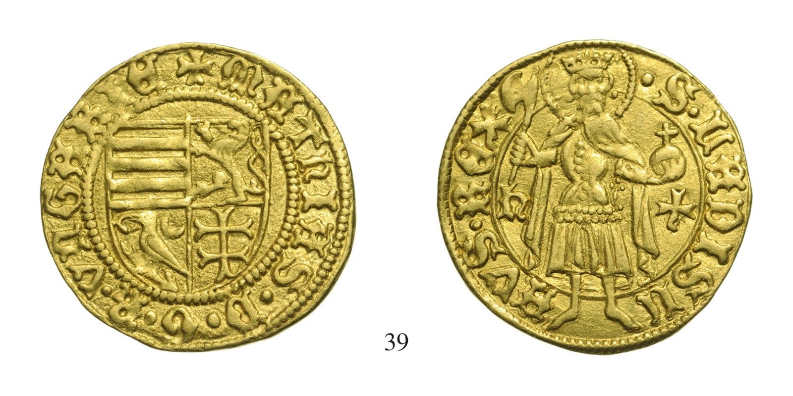 Hunyadi Mátyás (1458-1490), Aranyforint /Goldgulden/ , Au , 1466-67 , Szeben /Hermannstadt/ , Av: +mAThIAS•D•G•R•VnGARIE négyrészt osztott címerpajzs /geviertes Wappen-Streifen, böhmischer Löwe, Rabe mit Ring und Halbmond, Doppelkreuz/ , Rv: •S•LADISL-AVS