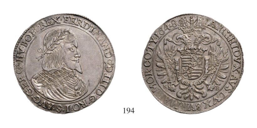 III. Ferdinánd (1637-1657), Tallér /Taler/ , Ag , 1648, Körmöcbánya /Kremnitz/ , Av: FERDINAND-III•D:G•RO•IS•AVG•GER•-•HV•BOH•REX* , Rv: ARC HIDVX•AVS•DVX•BVR•MAR•MO•CO•TY•1648 oldalt verdejegy /zur Seite Mzz./ K-B , 28,59 g, Huszár: 1241, Unger II.: 939/