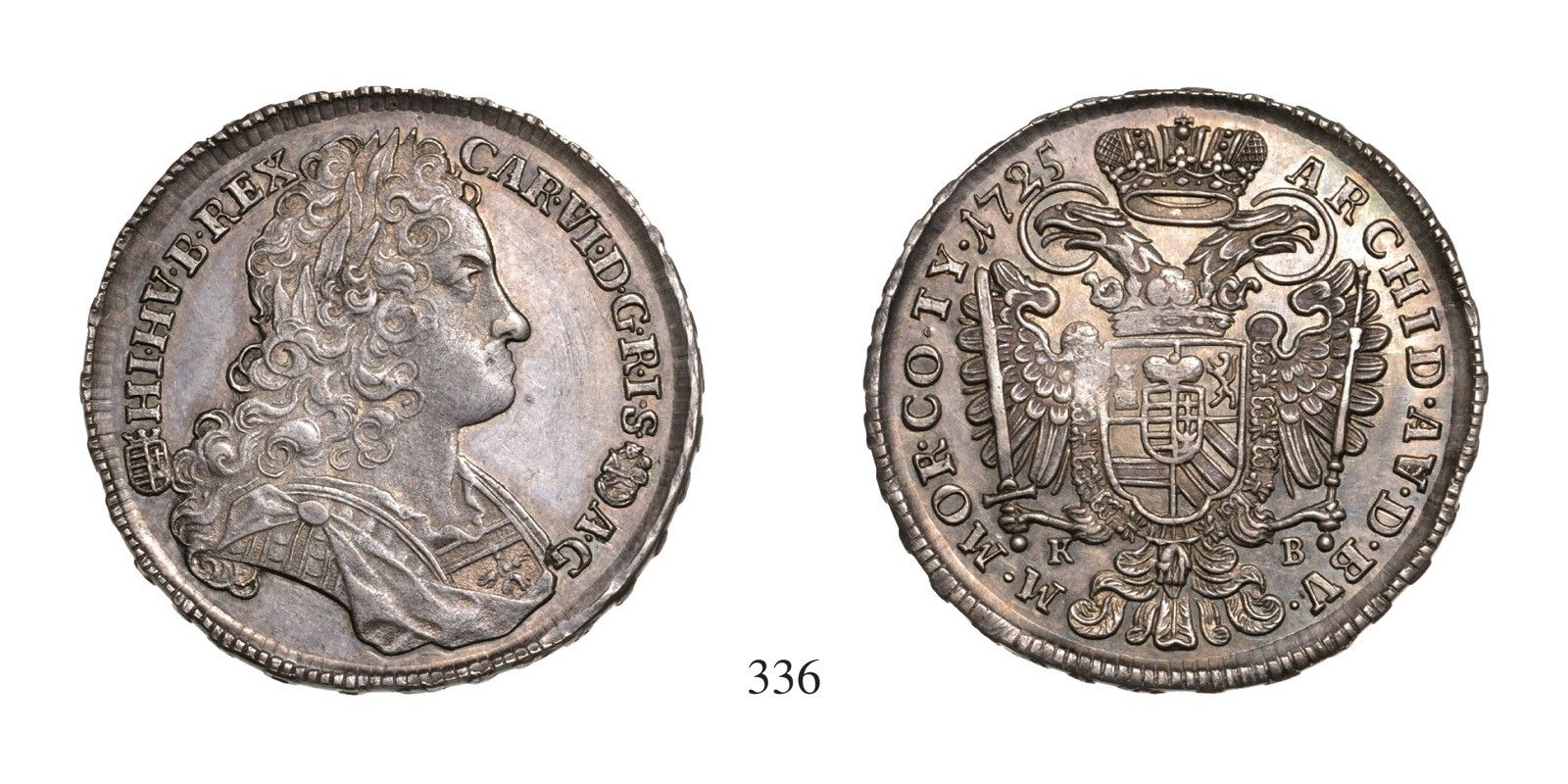 III. Károly (1711-1740), ½ Tallér /Taler/ , Ag , 1725, Körmöcbánya /Kremnitz/ , mint elôzô, de peremirattal /wie vorher, aber mit Randschrift/ Av: CAR•VI•D•G•R•I•S-A•G-HI•HV•B•REX• , Rv: ARCHID•AV•D•BU•-M•MOR•CO•TY•1725 alul kétoldalt verdejegy /zur Seite