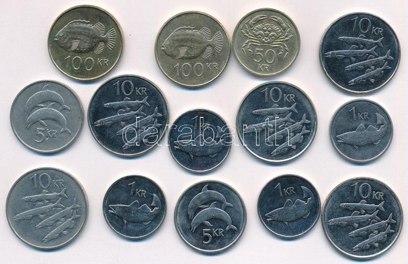 Izland 1925-1942. 1e – 2K (6xklf) forgalmi összeállítás karton díszlapon + 1984-1999. 5K (2x) + 1987-2007. 50K (3x) + 1994-2007. 1K (4x) + 1994-2004. 10K (4x) T:1-,2 Iceland 1925-1942. 1 Eyrir – 2 Kronur (6xdiff) coin set on cardboard display