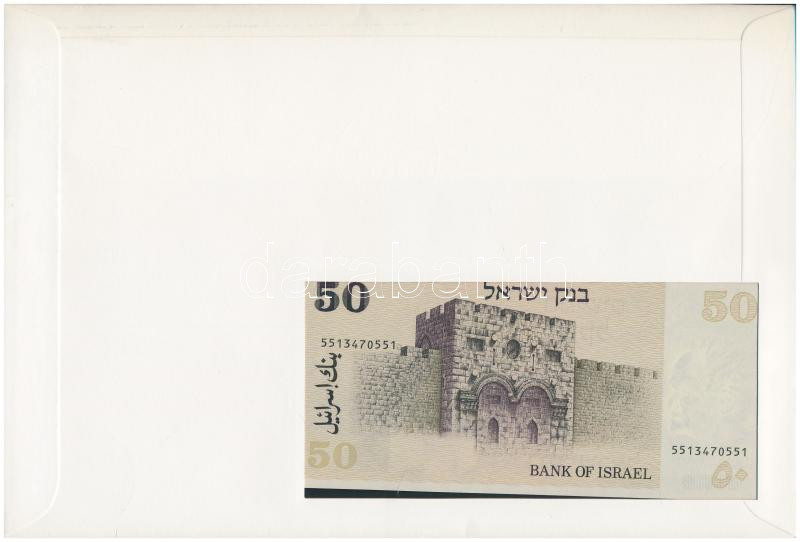 Izrael 1978. 50S felbélyegzett borítékban, bélyegzéssel T:1,1- Israel 1978. 50 Sheqalim in envelope with stamp and cancellation C:UNC,AU<a href="https://www.darabanth.com/hu/gyorsarveres/431/kategoriak~Numizmatika/Ermes-es-bankjegyes-boritekok~1500