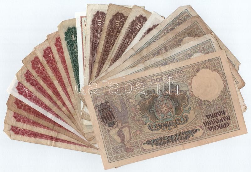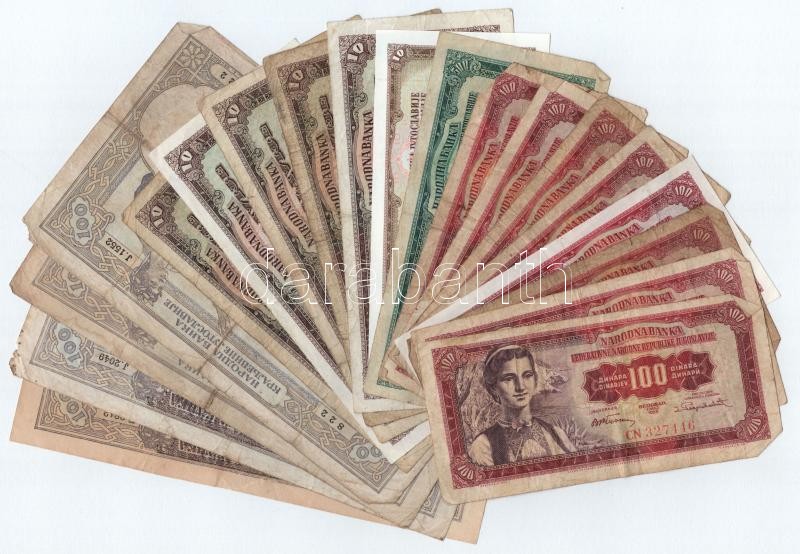 Jugoszlávia 1929. 100D ‘I. Sándor’ vízjel (2x) + Szerbia / Német megszállás 1941. 100D (2x) + Jugoszlávia 1955-1968. 10D-500D (15db) T:I-III- Yugoslavia 1929. 100 Dinara with ‘Alexander I’ watermark (2x) + Serbia / German occupation 1941. 100 Dinara (2x)