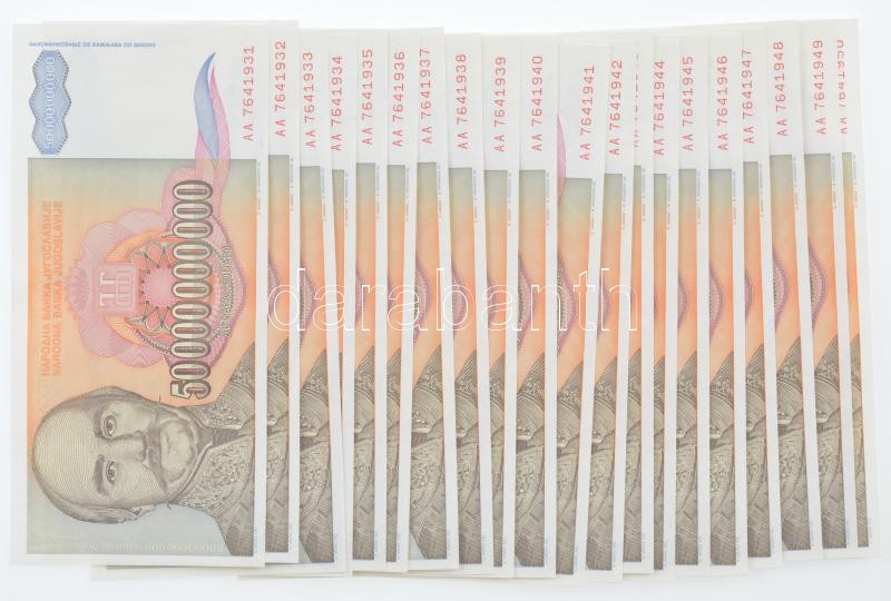 Jugoszlávia 1993. 50.000.000.000D (20x) sorszámkövetők ‘AA 7641931 – AA 7641950’ T:I hullámos papír Yugoslavia 1993. 50.000.000.000 Dinara (20x) consecutive serials ‘AA 7641931 – AA 7641950’ C:UNC,AU wavy paper