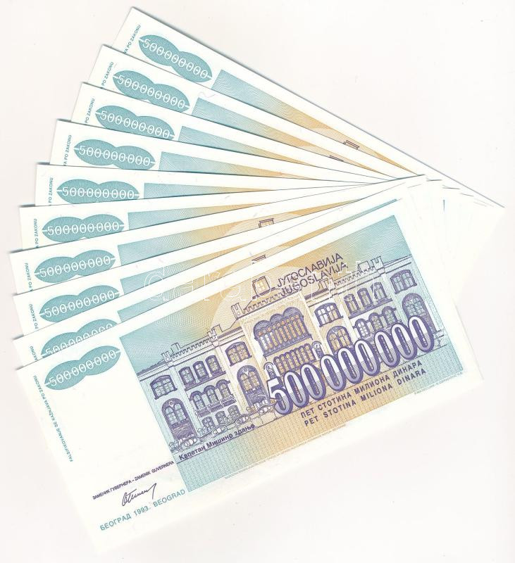 Jugoszlávia 1993. 500.000.000D (10x) sorszámkövetők ‘AB 4916611 – AB 4916620’ T:I- Yugoslavia 1993. 500.000.000 Dinara (10x) consecutive serials ‘AB 4916611 – AB 4916620’ C:AU Krause P#134<a href="https://www.darabanth.com/hu/gyorsarveres/435/kateg
