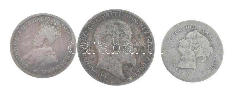 Kanada ~1858-1901. 5c Ag ‘Viktória’ (1,05g) + Nagy-Britannia 1906. 6p Ag ‘VII. Eduárd’ (2,67g) + Ausztrália 1918. 3p Ag ‘V. György’ (1,35g) T:3 patina, hajlott Canada ~1858-1901. 5 Cents Ag ‘Victoria’ (1,05g) + Great Britain 1906. 6 Pence Ag ‘Edward VII’