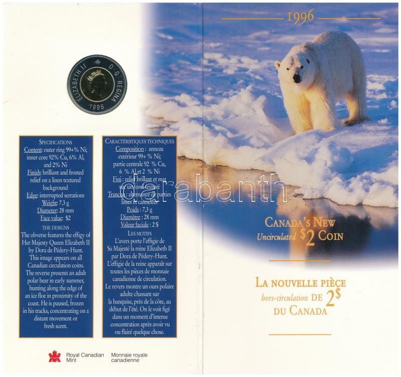Kanada 1996. 2$ bimetál ‘Jegesmedve’ díszkiadásban, eredeti tokban T:1 Canada 1996. 2 Dollars bimetallic ‘Polar Bear’ in original cardboard case C:UNC Krause KM#270<a href="https://www.darabanth.com/hu/gyorsarveres/417/kategoriak~Numizmatika/Kulfold