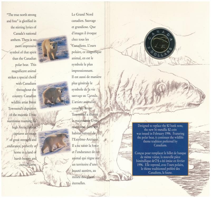 Kanada 1996. 2$ bimetál ‘Jegesmedve’ díszkiadásban, eredeti tokban T:1 Canada 1996. 2 Dollars bimetallic ‘Polar Bear’ in original cardboard case C:UNC Krause KM#270