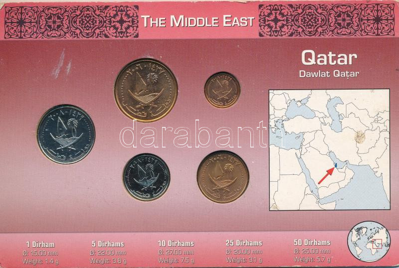 Katar 2006-2008. 1D-50D (5xklf) forgalmi összeállítás kicsit sérült kartonlapon T:1,1- Qatar 2006-2008. 1 Dirham – 50 Dirham (5xdiff) coin set on small damaged cardboard sheet C:UNC,AU<a href="https://www.darabanth.com/hu/gyorsarveres/435/kategoriak