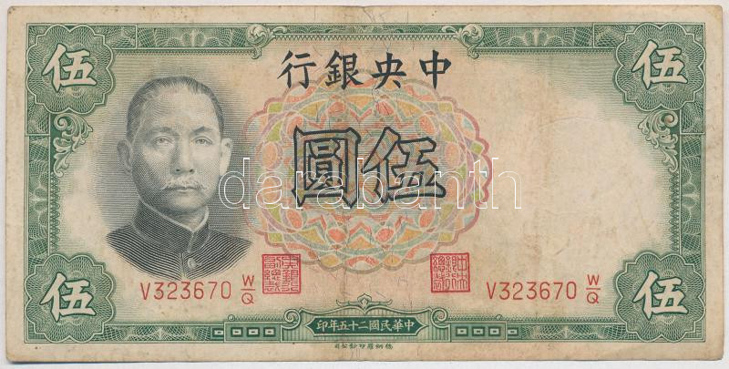 Kína 1936. 5Y T:III China 1936. 5 Yuan C:F Krause P#214a<a href="https://www.darabanth.com/hu/gyorsarveres/434/kategoriak~Numizmatika/Kulfoldi-bankjegyek~1500014/Kina-1936-5Y-TIII-China-1936-5-Yuan-CF-Krause-P23214a~II2772384/?utm_source=affiliate&u