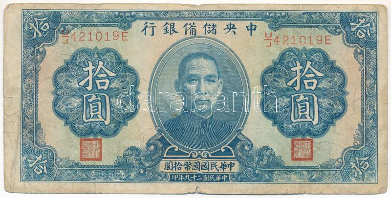 Kína / Central Reserve Bank of China 1940. 10Y T:III- kis szakadás, tűlyuk China / Central Reserve Bank of China 1940. 10 Yuan C:VG small tear, needle hole Krause P#J12<a href="https://www.darabanth.com/hu/gyorsarveres/438/kategoriak~Numizmatika/Kul