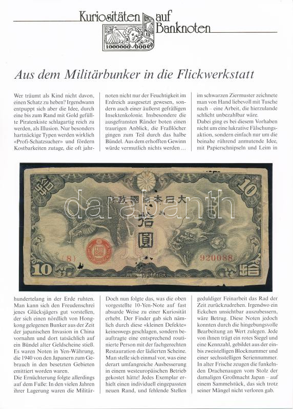 Kína / Japán megszállás 1940. 10Y német leírással T:III- lyukak China / Japanese occupation 1940. 10 Yen with german description C:VG holes Krause P# M19<a href="https://www.darabanth.com/hu/gyorsarveres/433/kategoriak~Numizmatika/Kulfoldi-bankjegye