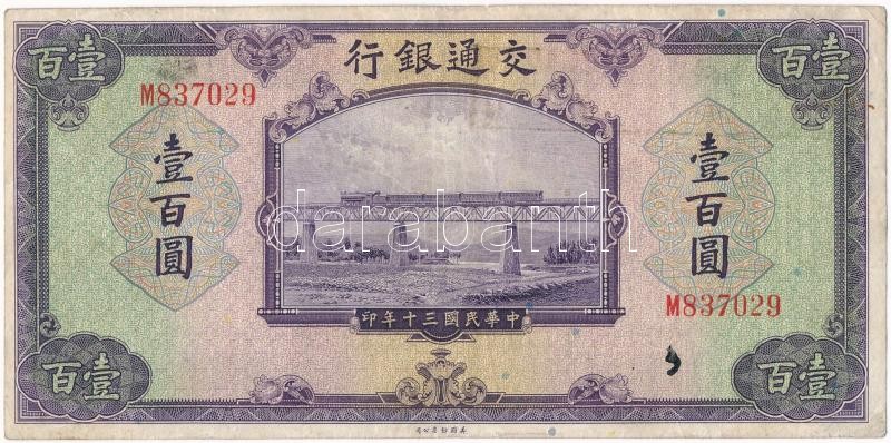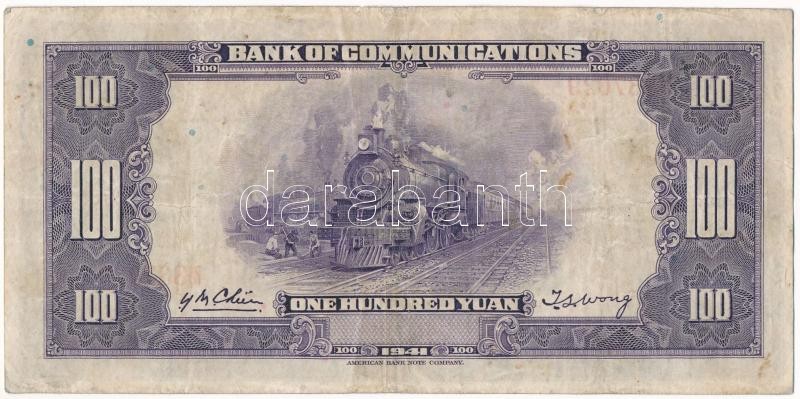 Kínai Köztársaság / Bank of Communications 1941. 100Y T:III Chinese Republic / Bank of Communications 1941. 100 Yuan C:F Krause P#162<a href="https://www.darabanth.com/hu/gyorsarveres/417/kategoriak~Numizmatika/Kulfoldi-bankjegyek~2000014/Kinai-Kozt