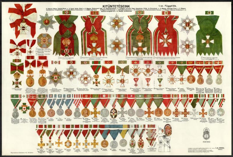 ‘Kitüntetéseink, I. sz. függelék’, magyar katonai kitüntetések felsorolása a Horthy-korszakból, képábrázolással, keménypapírra ragasztva, 1944-ig. Kiadta a Magyar Királyi Térképészeti Intézet. Modern másolat (!), kartonon, 28×42 cm<a href="https://w