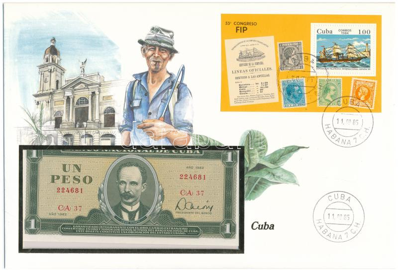 Kuba 1982. 1P felbélyegzett borítékban, bélyegzéssel T:I Cuba 1982. 1 Peso in envelope with stamp and cancellation C:UNC<a href="https://www.darabanth.com/hu/gyorsarveres/434/kategoriak~Numizmatika/Ermes-es-bankjegyes-boritekok~1500004/Kuba-1982-1P-