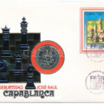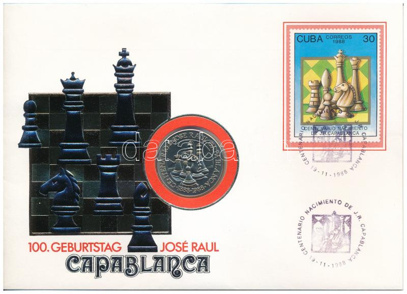Kuba 1988. 1P Cu-Ni ‘José Raúl Capablanca születésének 100. évfordulója emlékére’ érme, érmés borítékban, bélyeggel, bélyegzéssel, német nyelvű tájékoztatóval T:BU patina Cuba 1988. 1P Cu-Ni ‘100th anniversary of the born of