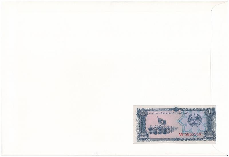 Laosz 1979-1988. 1K felbélyegzett borítékban, bélyegzéssel T:I Laos 1979-1988. 1 Kip in envelope with stamp and cancellation C:UNC<a href="https://www.darabanth.com/hu/gyorsarveres/434/kategoriak~Numizmatika/Ermes-es-bankjegyes-boritekok~1500004/La