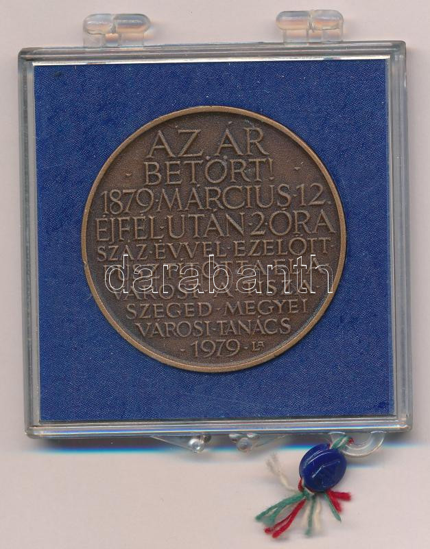 Lapis András (1942-) 1979. ‘Az ár betört! 1879 Március 12. éjfél után 2 óra – Száz évvel ezelőtt pusztította el a várost a Tisza – Szeged Megyei Városi Tanács’ kétoldalas bronz emlékérem eredeti plombált ÁPV tokban (42,5mm) T:1,1-<a href="https://ww