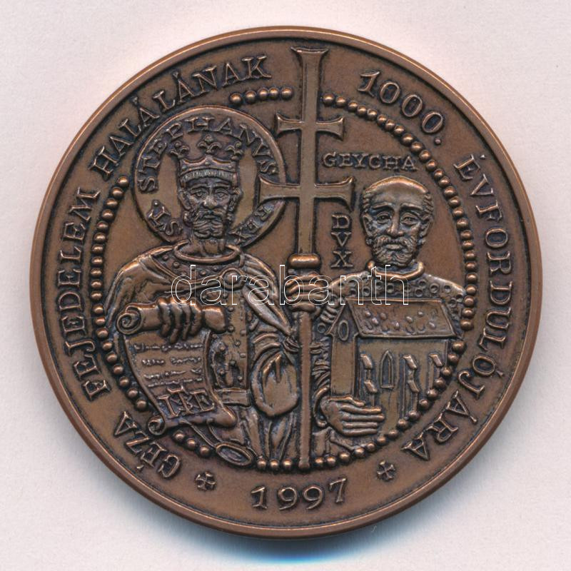 Lebó Ferenc (1960-) 1997. ‘Géza fejedelem halálának 1000. évfordulójára’ kétoldalas bronz emlékérem (42mm) T:1-<a href="https://www.darabanth.com/hu/gyorsarveres/436/kategoriak~Numizmatika/Magyar-emlekveretek-plakettek~1500009/Lebo-Ferenc-1960-1997-