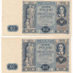 Lengyelország 1936. 20Zl (2x) sorszámkövetők ‘CX 7355348 – CX 7355349’ T:AU Poland 1936. 20 Zlotych (2x) consecutive serials ‘CX 7355348 – CX 7355349’ C:F Krause P#77<a href="https://www.darabanth.com/hu/gyorsarveres/439/kategoriak~Numizmatika/Kulf