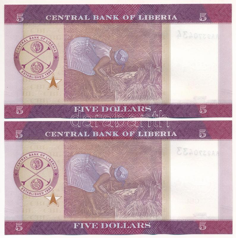 Libéria 2016. 5$ (2x) sorszámkövetők ‘AA9370433 – AA9370434’ T:I Liberia 2016. 5 Dollars (2x) consecutive serials ‘AA9370433 – AA9370434’ C:UNC<a href="https://www.darabanth.com/hu/gyorsarveres/432/kategoriak~Numizmatika/Kulfoldi-bankjegyek~1500014/