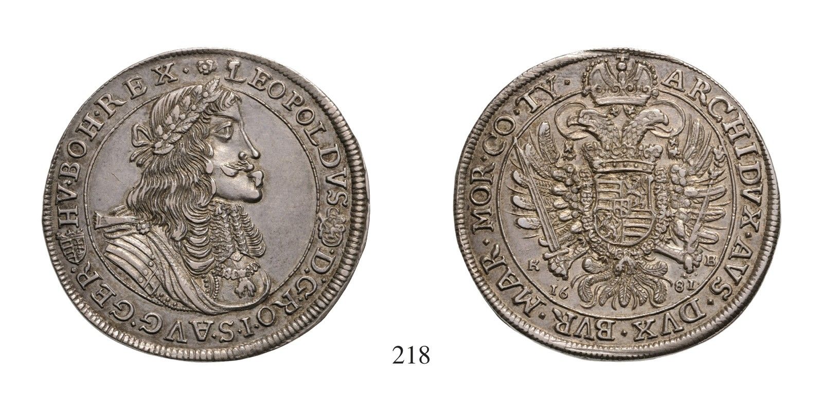 Lipót (1657-1705), Tallér /Taler/ , Ag , 1681, Körmöcbánya /Kremnitz/ , mellkép páncélban, évszám a hátlapon kétoldalt a verdejegy alatt /Brustbild im Harnisch, Jahreszahl zur Seite des Adlers/ Av: LEOPOLDVS- •D:G•RO•I•S•AVG•GER•-HV•BOH•REX•* , Rv: ARCHID