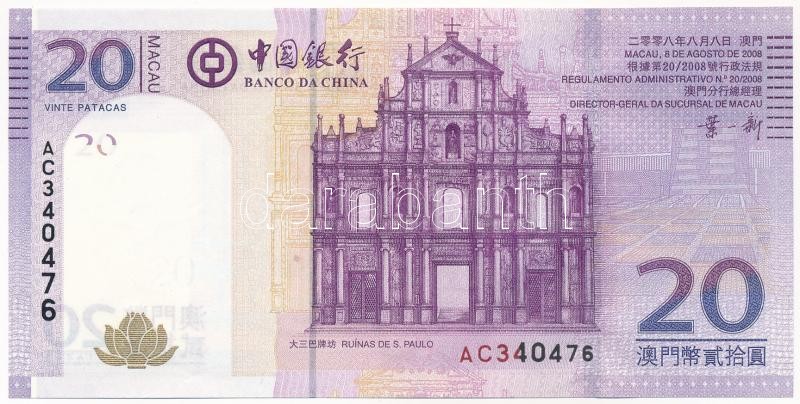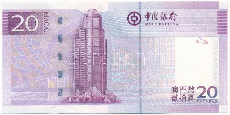Makaó 2008. 20P ‘AC 340476’ T:II kissé hullámos papír Macau 2008. 20 Patacas ‘AC 340476’ C:XF slightly wavy paper Krause P#109a<a href="https://www.darabanth.com/hu/gyorsarveres/417/kategoriak~Numizmatika/Kulfoldi-bankjegyek~2000014/Makao-2008-20P-A