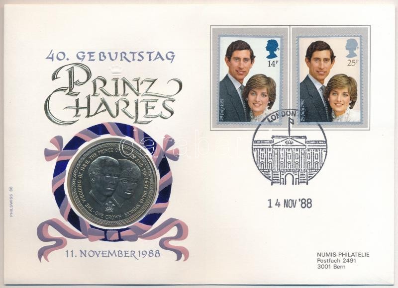 Man-sziget 1981. 1C Cu-Ni ‘Királyi esküvő – 2. típus’ érmés borítékban bélyeggel, bélyegzéssel, német nyelvű tájékoztatóval T:1 Isle of Man 1981. 1 Crown Cu-Ni ‘Royal Wedding – 2nd variety’ in coin envelope with stamps and cancellations, with german lang