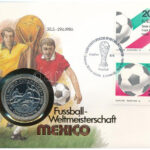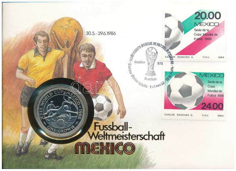 Man-sziget 1986. 1C Cu-Ni ‘Labdarúgó Világbajnokság 1986’ felbélyegzett borítékban, bélyegzéssel, német nyelvű leírással T:1 Isle of Man 1986. 1 Crown Cu-Ni ‘Football World Cup 1986’ in envelope with stamp and cancellation, with german description C:UNC K