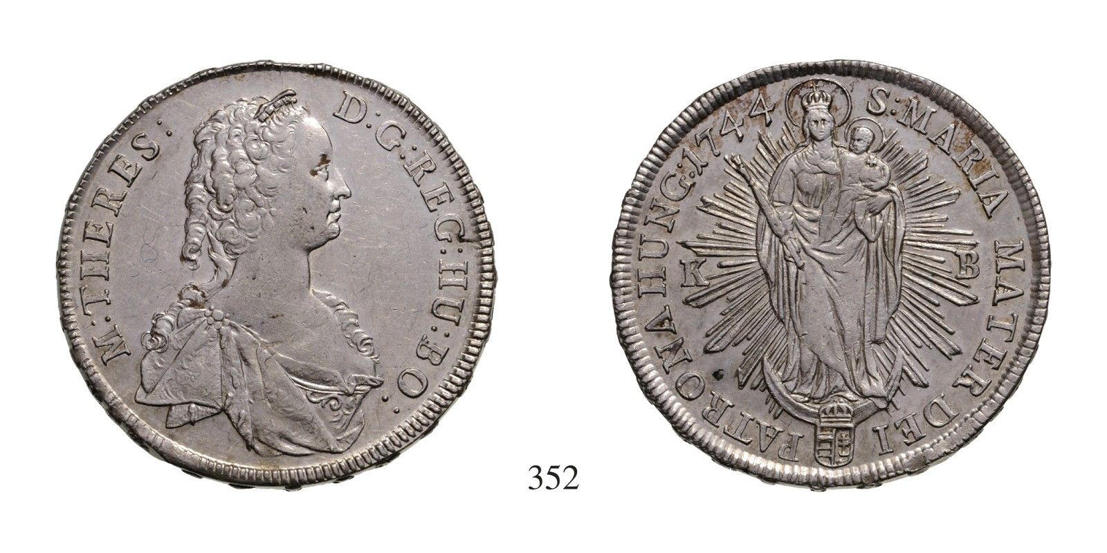 Mária Terézia (1740-1780), Tallér /Taler/ , Ag , 1744, Körmöcbánya /Kremnitz/ , mint elôzô, de eltérô rajzolattal /wie vorher, aber anders gezeichnet/ Av: M:THERES:-D:G:REG:HU:BO: , Rv: S:MARIA MATER DEI-PATRONA HUNG:1744 oldalt verdejegy /zur Seite Mzz./