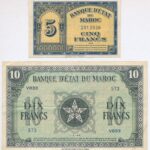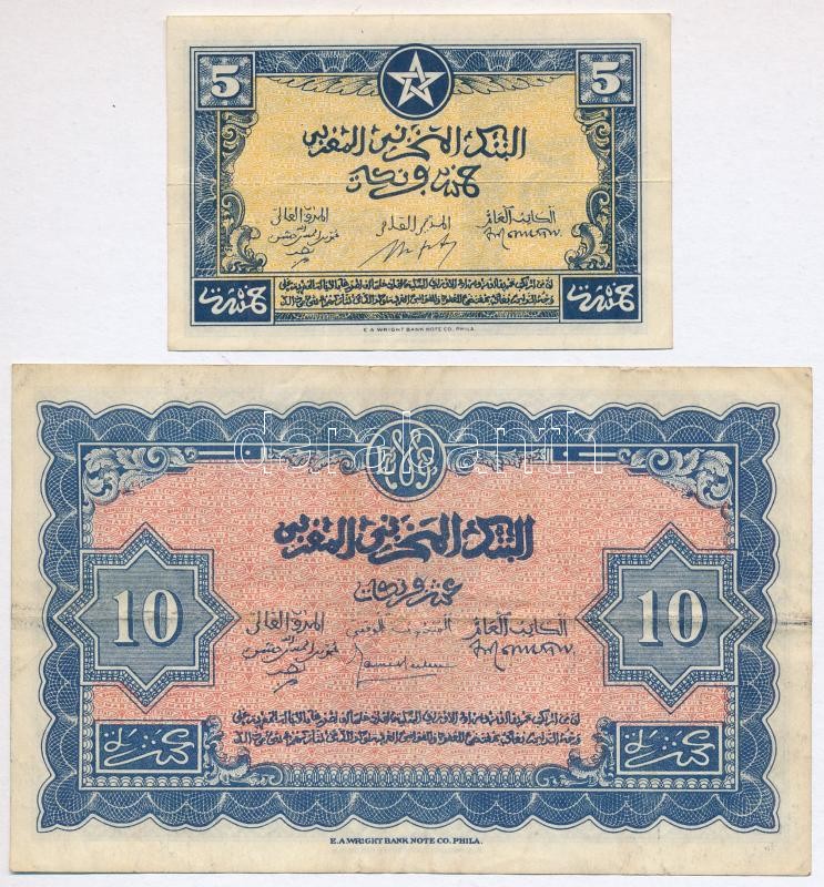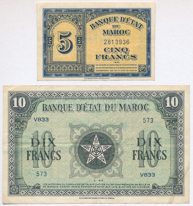 Marokkó 1943. 5Fr + 10Fr T:III Morocco 1943. 5 Francs + 10 Francs C:F Krause P#24, P#25<a href="https://www.darabanth.com/hu/gyorsarveres/409/kategoriak~Numizmatika/Kulfoldi-bankjegyek~2500013/Marokko-1943-5Fr-plus-10Fr-TIII-Morocco-1943-5-Francs-pl