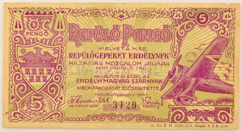 Marosvásárhely 1941. 5P „Repülő-Pengő – Repülőgépeket Erdélynek” hátoldalán bélyegzéssel T:F ly., kis szakadás Hungary / Marosvásárhely (Targu Mures) 1941. 5 Pengő „Flying-Pengő – Planes for Transylvania” with cancellation on backside C:F hole, small tear