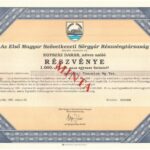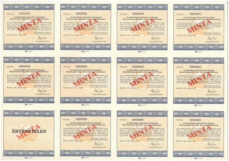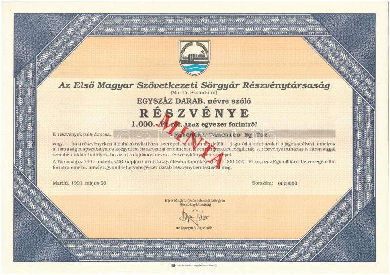 Martfű 1991. ‘Első Magyar Szövetkezeti Sörgyár Részvénytársaság’ kitöltetlen, névre szóló részvénye, ‘MINTA’ felülbélyegzéssel, 000-ás sorszámmal, szelvényekkel T:I<a href="https://www.darabanth.com/hu/gyorsarveres/413/kategoriak~Numizmatika/Reszven