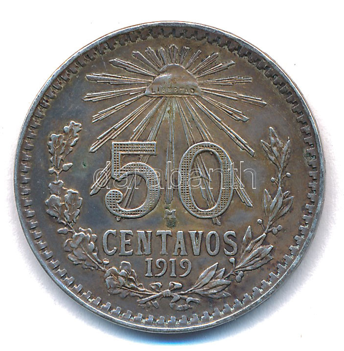 Mexikó 1919M 50c Ag T:XF patina Mexico 1919M 50 Centavos Ag C:XF patina Krause KM#447<a href="https://www.darabanth.com/hu/gyorsarveres/438/kategoriak~Numizmatika/Kulfoldi-fem-es-ezustpenzek~1500014/Mexiko-1919M-50c-Ag-TXF-patina-Mexico-1919M-50-Cen