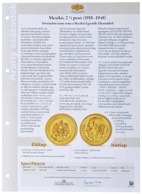 Mexikó 1945. (1951-1972) 2 1/2P Au kapszulában, tanúsítvánnyal (2,04g/0.900) T:1,1- kis patina, apró, halvány karc Mexico 1945. (1951-1972) 2 1/2 Pesos Au in capsule, with certificate (2,04g/0.900) C:UNC,AU small patina, small, pale