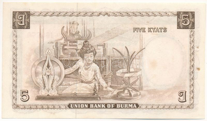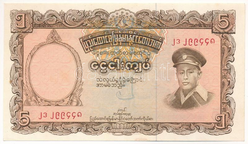 Mianmar / Burma 1958. 5K T:I- fo., tűlyukak Myanmar / Burma 1958. 5 Kyats C:AU spotted, pin holes Krause P#47<a href="https://www.darabanth.com/hu/gyorsarveres/432/kategoriak~Numizmatika/Kulfoldi-bankjegyek~1500014/Mianmar-Burma-1958-5K-TI-fo-tulyuk