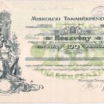 Miskolc 1926. ‘Miskolczi Takarékpénztár’ névre szóló öt darab részvénye egyben összesen 100P-ről, szelvényekkel, bélyegzéssel és szárazpecséttel T:II
