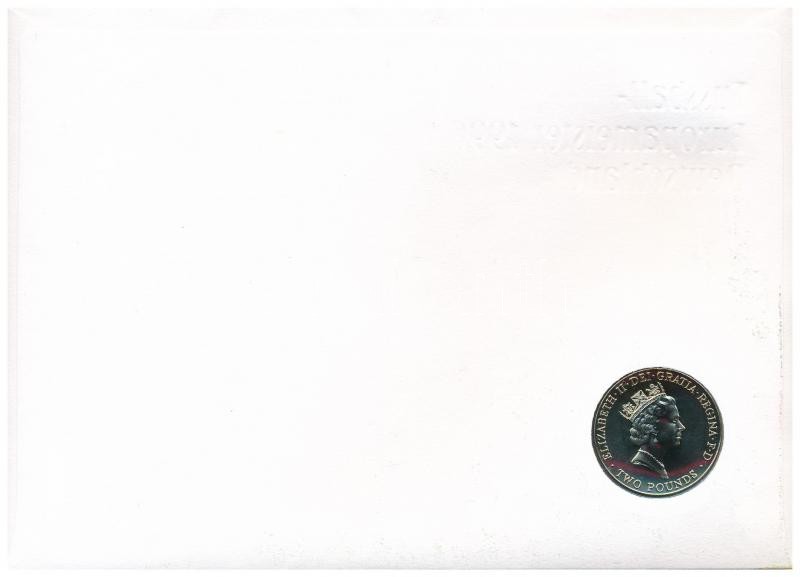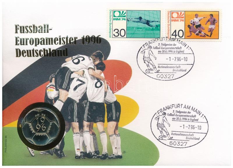 Nagy-Britannia 1996. 2P ‘Labdarúgó Európa Bajnokság 1996’ érme, érmés borítékban, bélyeggel, bélyegzéssel, német nyelvű leírással T:1 Great Britain 1996. 2 Pounds ‘Football European Championship 1996’ coin in envelope with stamp and cancellation, with Ge