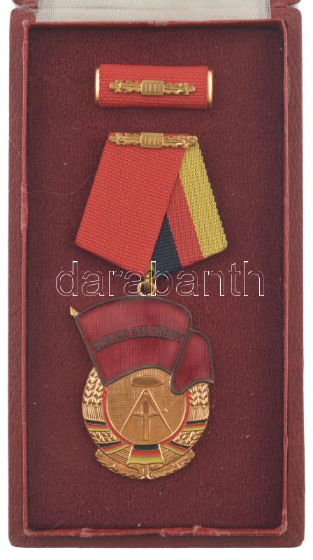 NDK 1978. ‘Munka Zászlaja’ zománcozott bronz kitüntetés, III. fokozat, mellszalagon, szalagsávval, eredeti, kissé sérült tokban T:1- GDR 1978. ‘Banner der Arbeit’ enamelled bronze decoration, 3rd grade, with ribbon and thin ribbon, in original, but damage