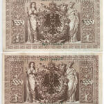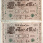 Német Birodalom 1910. 1000M piros pecsét, hétjegyű sorszámmal (3db, sorszámkövető) + 1910. 1000M zöld pecsét, hétjegyű sorszámmal (2db, sorszámkövető) T:III folt German Empire 1910. 1000 Mark with red seal, 7 digit serial (3pcs,