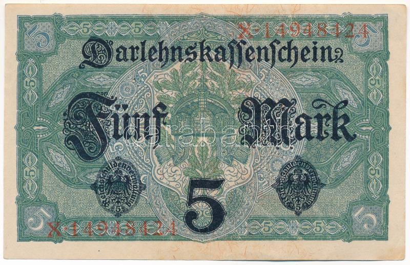 Német Birodalom 1917. 5M T:I-,II German Empire 1917. 5 Mark C:AU,XF Krause P#56<a href="https://www.darabanth.com/hu/gyorsarveres/438/kategoriak~Numizmatika/Kulfoldi-bankjegyek~1500013/Nemet-Birodalom-1917-5M-TI-II-German-Empire-1917-5-Mark-CAU-XF-K