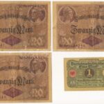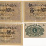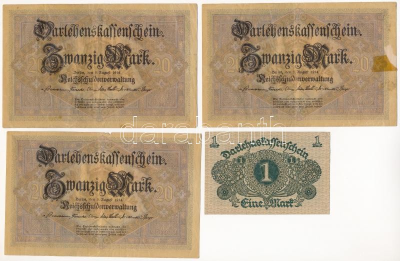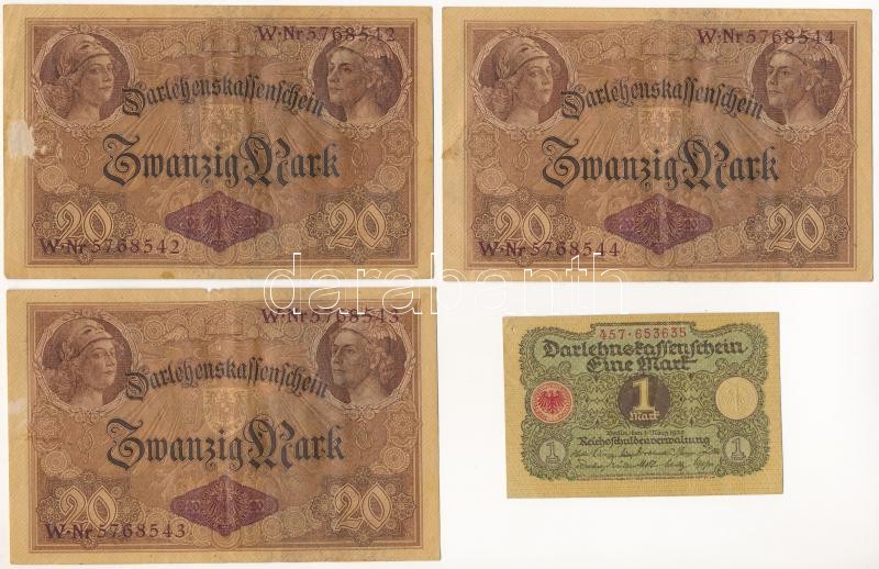 Német Birodalom / Weimari Köztársaság 1914. 20M (3x) sorszámkövetők ‘W 5768542 – W 5768544’ + 1920. 1M T:III,III- anyaghiány, kis szakadás, ragasztónyom, ly. German Empire / Weimar Republic 1914. 20 Mark (3x) consecutive serial numbers ‘W 5768542 – W 5768