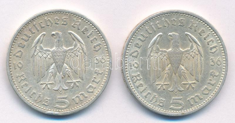 Német Harmadik Birodalom 1936A 5M Ag ‘Hindenburg’ (2x) T:2 German Third Reich 1936A 5 Mark Ag ‘Hindenburg’ (2x) C:XF Krause KM#86<a href="https://www.darabanth.com/hu/gyorsarveres/434/kategoriak~Numizmatika/Kulfoldi-fem-es-ezustpenzek~1500015/Nemet-