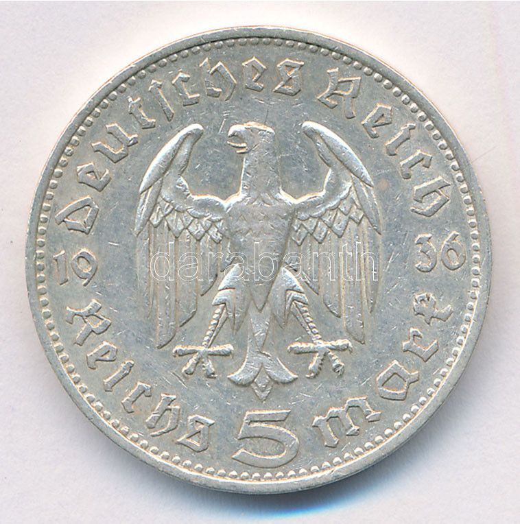 Német Harmadik Birodalom 1936A 5M Ag ‘Hindenburg’ T:2- German Third Reich 1936A 5 Mark Ag ‘Hindenburg’ C:VF Krause KM# 86<a href="https://www.darabanth.com/hu/gyorsarveres/432/kategoriak~Numizmatika/Kulfoldi-fem-es-ezustpenzek~1500015/Nemet-Harmadik