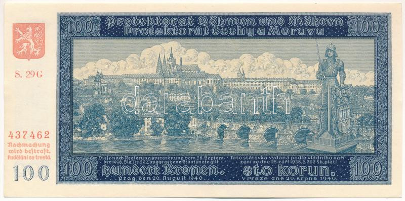 Német Harmadik Birodalom / Cseh-Morva Protektorátus 1940. 100K ‘S.29 G 437462’ II. kiadás T:I,I- German Third Reich / Protectorate of Bohemia and Moravia 1940. 100 Korun ‘S.29 G 437462’ 2nd issue C:UNC,AU Krause P#7<a href="https://www.darabanth.com
