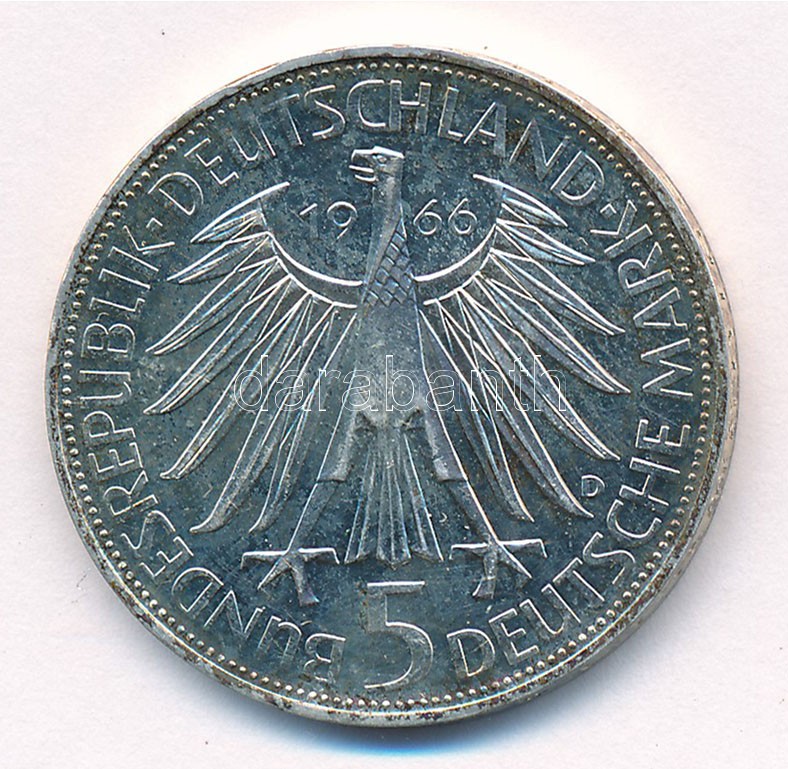 Német Szövetségi Köztársaság 1966D 5M Ag ‘Leibniz’ T:PP fo., ujjlenyomat Federal Republic Germany 1966D 5 Mark Ag ‘Leibniz’ C:PP spotted, fingerprint Krause 119.1<a href="https://www.darabanth.com/hu/gyorsarveres/411/kategoriak~Numizmatika/Kulfoldi-