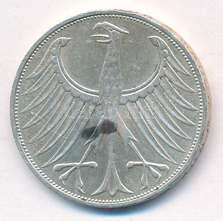Német Szövetségi Köztársaság 1973J 5M Ag T:2 fo. Federal Republic Germany 1973J 5 Mark Ag C:XF spotted Krause KM#112.1<a href="https://www.darabanth.com/hu/gyorsarveres/433/kategoriak~Numizmatika/Kulfoldi-fem-es-ezustpenzek~2000007/Nemet-Szovetsegi-