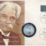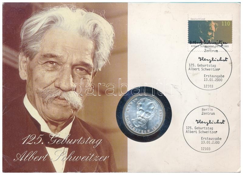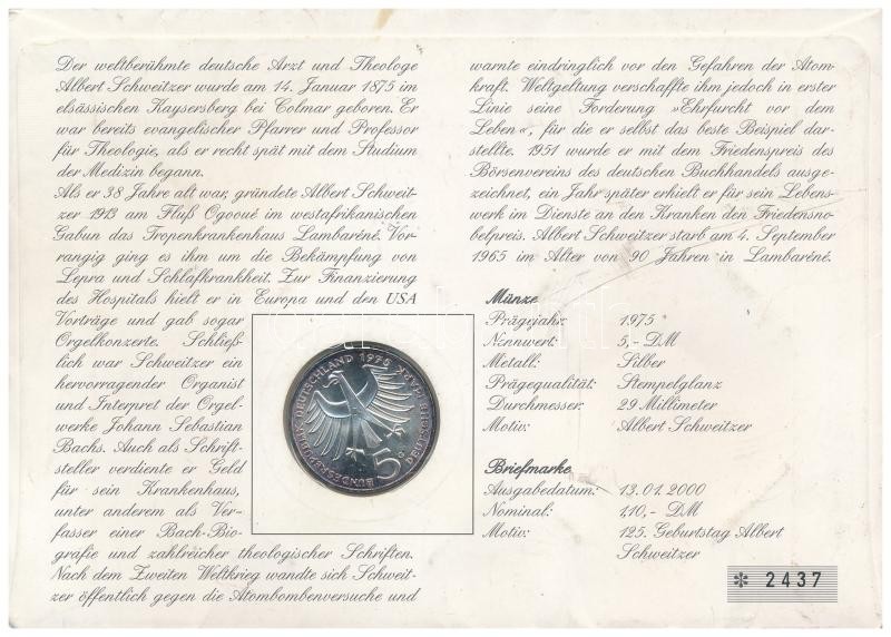Német Szövetségi Köztársaság 1975G 5M Ag ‘Albert Schweitzer’ érmés borítékban, elsőnapi bélyegzéses bélyeggel T:1 patina Federal Republic of Germany 1975G 5 Mark ‘Albert Schweitzer’ in coin envelope with first day of issue stamp,